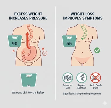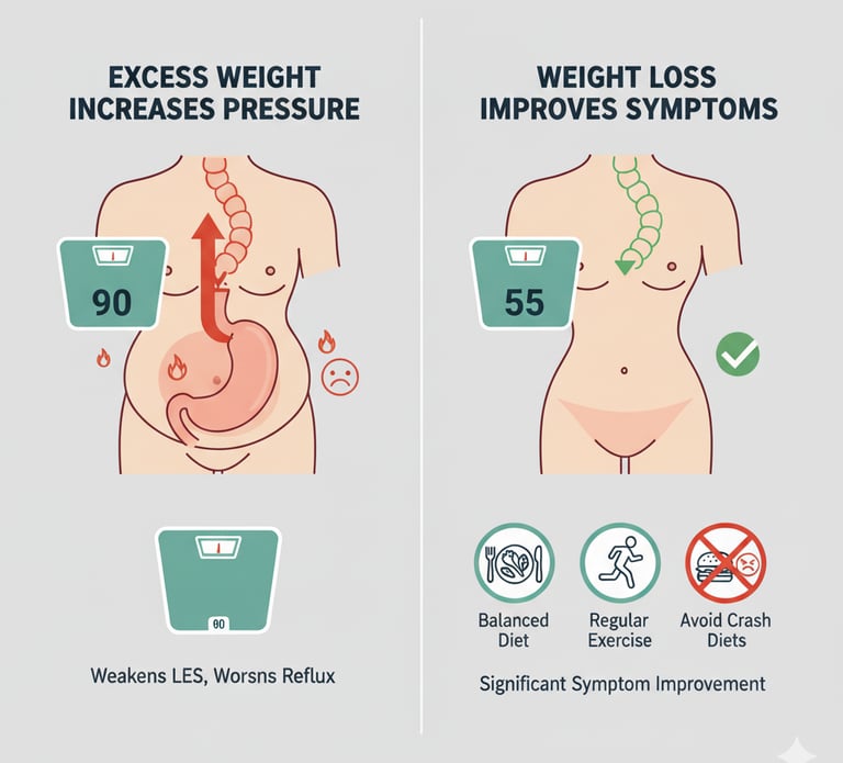 Excess weight increases abdominal pressure, which can weaken the LES and worsen reflux. Losing even a small amount of weight can lead to significant improvement in symptoms. Focus on a balanced diet, regular exercise, and avoiding crash diets that may irritate your stomach.