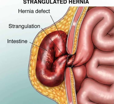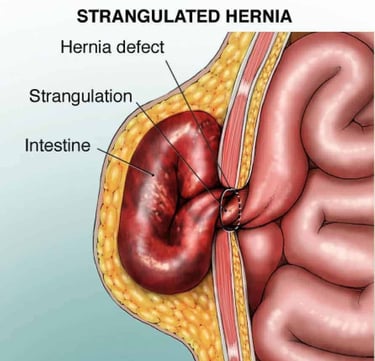 In early cases it's obviously not an emergency, but guys don't ignore it because over time it turns into a life threatening emergency. Now the question you might have is : How can hernia be an emergency? So to answer that... If a hernia is left untreated, it can become strangulated (i.e. cut-off of blood supply to the herniated content usually part of gut) and require emergency surgery. An incarcerated hernia occurs when the protruding organ or fat becomes pinched so tightly that it cannot be pushed back into the abdomen or groin.